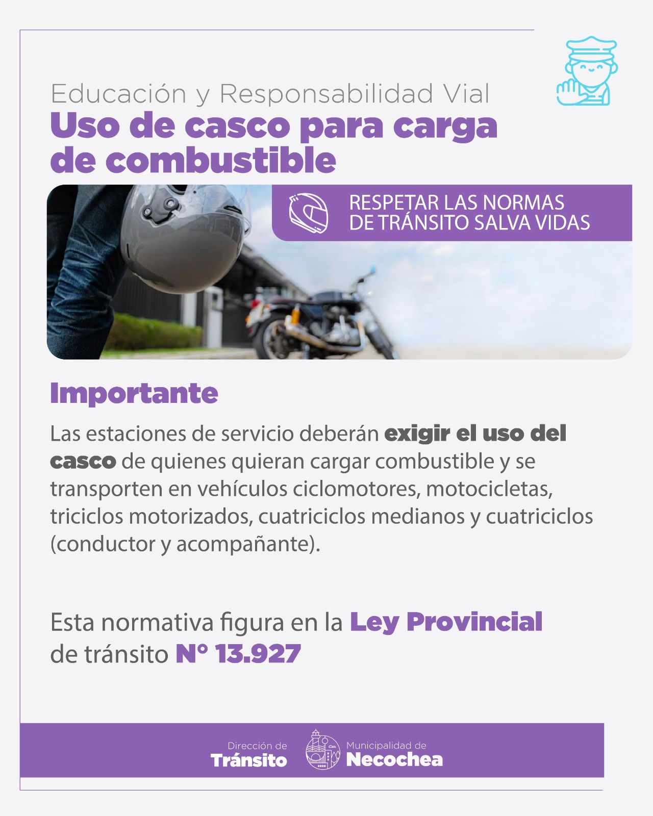 Las direcciones de Tránsito y Control Urbano de la Municipalidad de Necochea, esta última a través de su Inspección de Comercio, comunicaron que se aplicará mayor rigurosidad en la vigilancia del despacho de combustible a los vehículos ciclomotores, motocicletas, triciclos motorizados, cuatriciclos livianos y cuatriciclos, cuando su conductor y acompañante no lleven consigo el casco reglamentario estipulado en el artículo 48 de la Ley Provincial Nº 13.927.