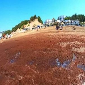 Fue sorprendente en la jornada de la víspera la aparición de gran cantidad de algas rojas en las playas de Quequen, un fenómeno pocas veces visto, en el último dia del fin de semana por Carnaval.