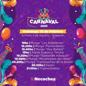 Valeria Garrido, responsable del Area de la Juventud de la comuna local, expresó que “habrá espectáculos, diversion y entretenimientos para todos los gustos. El domingo, por ejemplo, habrá un total de 6 murgas, y el cierre de Kpeto a las 20.50 y luego Trasnochados desde las 21.10”