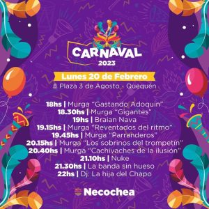 En lo que respecta al lunes, Garrido dijo que “también habra un total de 6 murgas, mas Brian Nava a las 19, Nuke a las 21.10, La Banda sin hueso a las 21.30 y Dj La hija del Chapo desde las 22. La idea es que los shows tengan agilidad y alegría, por lo que invitamos a toda la comunidad en general a pasarla realmente bien”