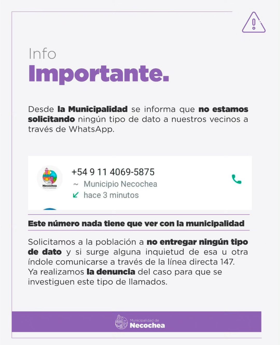 En las últimas horas circuló una línea con prefijo de Buenos Aires (11- 4069-5875) y el logo de la Municipalidad de Necochea llamando a distintos domicilios de nuestra ciudad y averiguando posibles daños posteriores al último temporal, tras lo cual solicitaban datos personales, pero se aclara que nada tiene que ver ello con la Municipalidad.